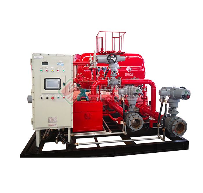 當(dāng)有火情發(fā)生時,自動或人工啟動消防水泵,平衡式的比例混合器有壓力水流過。由消防控制中心遙控開啟或自動化控制柜打開泡沫原液進(jìn)口閥和水輪機(jī)控制閥(電動機(jī)和柴油機(jī)驅(qū)動時則沒有水輪機(jī)控制閥),同時啟動泡沫液泵,儲存在常壓泡沫罐內(nèi)的泡沫液由泡沫液泵注入比例混合器,經(jīng)過平衡閥的自動調(diào)節(jié)后使得適量的泡沫液進(jìn)入比例混合器與壓力水按比例混合成泡沫混合液。再通過管道供給消防用泡沫發(fā)生設(shè)備,如泡沫槍、泡沫炮、泡沫產(chǎn)生器等,產(chǎn)生空氣泡沫撲救甲、乙、丙類液體火災(zāi)。